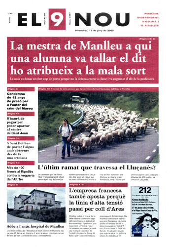 20050617 20050617 | El 9 Nou 17/06/2005 Notícies relacionades LA PREGUNTA Veu bé que el president dels bisbes espanyols opini sobre política? Sí No En aquesta enquesta han votat 298 persones. Vota Les + vistes Set detinguts i una vintena de denúncies en un dispositiu Kanpai contra la multireincidència a Vic i Manlleu Fan malbé el ninot de l'escola Joan Maragall de Ripoll Obriran un centre privat de diagnòstic per la imatge a Vic amb una inversió de 6 milions d'euros La febre per trobar el número de loteria de l'anunci d'un torró ha arribat fins a Tona El personal sanitari del CAP del Remei de Vic fa un pessebre vivent solidari Girbau celebra un dinar de jubilats a les portes de Nadal Els germans Pujol de la Granja Armengol, els nous 'influencers' de la vida a pagès La Generalitat confirma el futur Palau de Justícia a l’Era d’en Sellés de Vic Els pobles osonencs que pertanyen a Girona no es plantegen demanar un canvi de província Refredat, grip i covid: símptomes semblants però malalties diferents