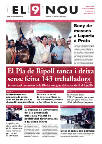 20050627 20050627 | El 9 Nou 27/06/2005 Notícies relacionades LA PREGUNTA Veu bé que el president dels bisbes espanyols opini sobre política? Sí No En aquesta enquesta han votat 297 persones. Vota Les + vistes Set detinguts i una vintena de denúncies en un dispositiu Kanpai contra la multireincidència a Vic i Manlleu Fan malbé el ninot de l'escola Joan Maragall de Ripoll Obriran un centre privat de diagnòstic per la imatge a Vic amb una inversió de 6 milions d'euros La febre per trobar el número de loteria de l'anunci d'un torró ha arribat fins a Tona El personal sanitari del CAP del Remei de Vic fa un pessebre vivent solidari Girbau celebra un dinar de jubilats a les portes de Nadal Els germans Pujol de la Granja Armengol, els nous 'influencers' de la vida a pagès La Generalitat confirma el futur Palau de Justícia a l’Era d’en Sellés de Vic Els pobles osonencs que pertanyen a Girona no es plantegen demanar un canvi de província Refredat, grip i covid: símptomes semblants però malalties diferents