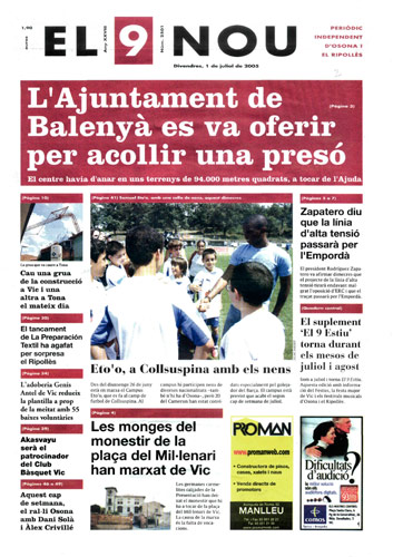 20050701 20050701 | El 9 Nou 01/07/2005 Notícies relacionades LA PREGUNTA Veu bé que el president dels bisbes espanyols opini sobre política? Sí No En aquesta enquesta han votat 291 persones. Vota Les + vistes Set detinguts i una vintena de denúncies en un dispositiu Kanpai contra la multireincidència a Vic i Manlleu La febre per trobar el número de loteria de l'anunci d'un torró ha arribat fins a Tona Fan malbé el ninot de l'escola Joan Maragall de Ripoll Obriran un centre privat de diagnòstic per la imatge a Vic amb una inversió de 6 milions d'euros Girbau celebra un dinar de jubilats a les portes de Nadal El personal sanitari del CAP del Remei de Vic fa un pessebre vivent solidari Osona Ripolles Els pobles osonencs que pertanyen a Girona no es plantegen demanar un canvi de província La Generalitat confirma el futur Palau de Justícia a l’Era d’en Sellés de Vic Aliança Catalana aconsegueix a última hora els suports per salvar 2,7 milions d'Europa per la nau del Pla de Ripoll