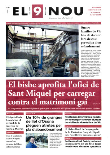 20050708 20050708 | El 9 Nou 08/07/2005 Notícies relacionades LA PREGUNTA Veu bé que el president dels bisbes espanyols opini sobre política? Sí No En aquesta enquesta han votat 324 persones. Vota Les + vistes Set detinguts i una vintena de denúncies en un dispositiu Kanpai contra la multireincidència a Vic i Manlleu Fan malbé el ninot de l'escola Joan Maragall de Ripoll Obriran un centre privat de diagnòstic per la imatge a Vic amb una inversió de 6 milions d'euros La febre per trobar el número de loteria de l'anunci d'un torró ha arribat fins a Tona El personal sanitari del CAP del Remei de Vic fa un pessebre vivent solidari Girbau celebra un dinar de jubilats a les portes de Nadal Els germans Pujol de la Granja Armengol, els nous 'influencers' de la vida a pagès La Generalitat confirma el futur Palau de Justícia a l’Era d’en Sellés de Vic Els pobles osonencs que pertanyen a Girona no es plantegen demanar un canvi de província Refredat, grip i covid: símptomes semblants però malalties diferents