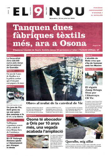20050722 20050722 | El 9 Nou 22/07/2005 Notícies relacionades LA PREGUNTA Veu bé que el president dels bisbes espanyols opini sobre política? Sí No En aquesta enquesta han votat 295 persones. Vota Les + vistes Set detinguts i una vintena de denúncies en un dispositiu Kanpai contra la multireincidència a Vic i Manlleu La febre per trobar el número de loteria de l'anunci d'un torró ha arribat fins a Tona Fan malbé el ninot de l'escola Joan Maragall de Ripoll Obriran un centre privat de diagnòstic per la imatge a Vic amb una inversió de 6 milions d'euros Girbau celebra un dinar de jubilats a les portes de Nadal El personal sanitari del CAP del Remei de Vic fa un pessebre vivent solidari Osona Ripolles Els pobles osonencs que pertanyen a Girona no es plantegen demanar un canvi de província La Generalitat confirma el futur Palau de Justícia a l’Era d’en Sellés de Vic Aliança Catalana aconsegueix a última hora els suports per salvar 2,7 milions d'Europa per la nau del Pla de Ripoll