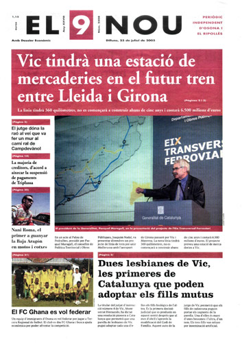 20050725 20050725 | El 9 Nou 25/07/2005 Notícies relacionades LA PREGUNTA Veu bé que el president dels bisbes espanyols opini sobre política? Sí No En aquesta enquesta han votat 295 persones. Vota Les + vistes Set detinguts i una vintena de denúncies en un dispositiu Kanpai contra la multireincidència a Vic i Manlleu La febre per trobar el número de loteria de l'anunci d'un torró ha arribat fins a Tona Fan malbé el ninot de l'escola Joan Maragall de Ripoll Obriran un centre privat de diagnòstic per la imatge a Vic amb una inversió de 6 milions d'euros Girbau celebra un dinar de jubilats a les portes de Nadal El personal sanitari del CAP del Remei de Vic fa un pessebre vivent solidari Osona Ripolles Els pobles osonencs que pertanyen a Girona no es plantegen demanar un canvi de província La Generalitat confirma el futur Palau de Justícia a l’Era d’en Sellés de Vic Aliança Catalana aconsegueix a última hora els suports per salvar 2,7 milions d'Europa per la nau del Pla de Ripoll