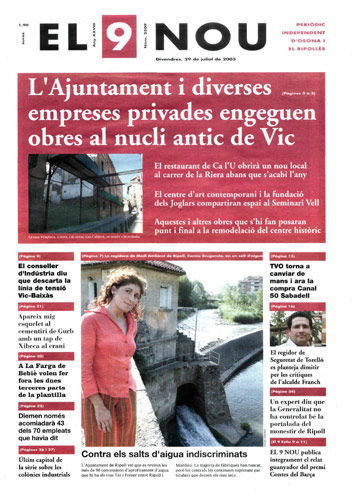 20050729 20050729 | El 9 Nou 29/07/2005 Notícies relacionades LA PREGUNTA Veu bé que el president dels bisbes espanyols opini sobre política? Sí No En aquesta enquesta han votat 291 persones. Vota Les + vistes Set detinguts i una vintena de denúncies en un dispositiu Kanpai contra la multireincidència a Vic i Manlleu La febre per trobar el número de loteria de l'anunci d'un torró ha arribat fins a Tona Fan malbé el ninot de l'escola Joan Maragall de Ripoll Obriran un centre privat de diagnòstic per la imatge a Vic amb una inversió de 6 milions d'euros Girbau celebra un dinar de jubilats a les portes de Nadal El personal sanitari del CAP del Remei de Vic fa un pessebre vivent solidari Osona Ripolles Els pobles osonencs que pertanyen a Girona no es plantegen demanar un canvi de província La Generalitat confirma el futur Palau de Justícia a l’Era d’en Sellés de Vic Aliança Catalana aconsegueix a última hora els suports per salvar 2,7 milions d'Europa per la nau del Pla de Ripoll