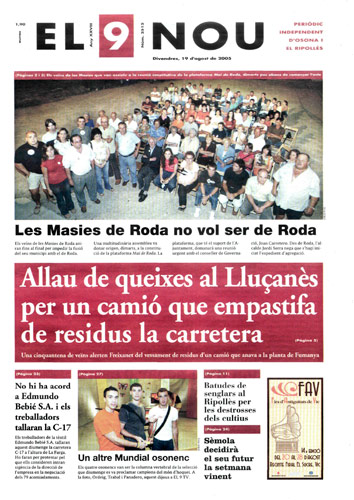 20050819 20050819 | El 9 Nou 19/08/2005 Notícies relacionades LA PREGUNTA Veu bé que el president dels bisbes espanyols opini sobre política? Sí No En aquesta enquesta han votat 297 persones. Vota Les + vistes Set detinguts i una vintena de denúncies en un dispositiu Kanpai contra la multireincidència a Vic i Manlleu Fan malbé el ninot de l'escola Joan Maragall de Ripoll Obriran un centre privat de diagnòstic per la imatge a Vic amb una inversió de 6 milions d'euros La febre per trobar el número de loteria de l'anunci d'un torró ha arribat fins a Tona El personal sanitari del CAP del Remei de Vic fa un pessebre vivent solidari Girbau celebra un dinar de jubilats a les portes de Nadal Els germans Pujol de la Granja Armengol, els nous 'influencers' de la vida a pagès La Generalitat confirma el futur Palau de Justícia a l’Era d’en Sellés de Vic Els pobles osonencs que pertanyen a Girona no es plantegen demanar un canvi de província Refredat, grip i covid: símptomes semblants però malalties diferents