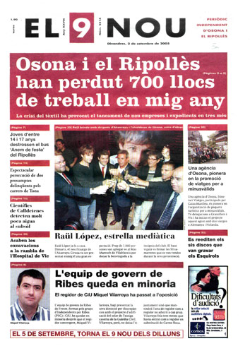 20050902 20050902 | El 9 Nou 02/09/2005 Notícies relacionades LA PREGUNTA Veu bé que el president dels bisbes espanyols opini sobre política? Sí No En aquesta enquesta han votat 295 persones. Vota Les + vistes Set detinguts i una vintena de denúncies en un dispositiu Kanpai contra la multireincidència a Vic i Manlleu La febre per trobar el número de loteria de l'anunci d'un torró ha arribat fins a Tona Fan malbé el ninot de l'escola Joan Maragall de Ripoll Obriran un centre privat de diagnòstic per la imatge a Vic amb una inversió de 6 milions d'euros Girbau celebra un dinar de jubilats a les portes de Nadal El personal sanitari del CAP del Remei de Vic fa un pessebre vivent solidari Osona Ripolles Els pobles osonencs que pertanyen a Girona no es plantegen demanar un canvi de província La Generalitat confirma el futur Palau de Justícia a l’Era d’en Sellés de Vic Aliança Catalana aconsegueix a última hora els suports per salvar 2,7 milions d'Europa per la nau del Pla de Ripoll