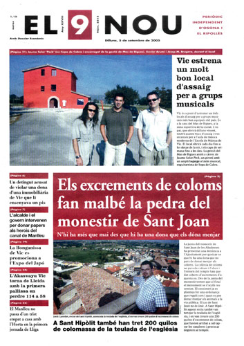 20050905 20050905 | El 9 Nou 05/09/2005 Notícies relacionades LA PREGUNTA Veu bé que el president dels bisbes espanyols opini sobre política? Sí No En aquesta enquesta han votat 291 persones. Vota Les + vistes Set detinguts i una vintena de denúncies en un dispositiu Kanpai contra la multireincidència a Vic i Manlleu La febre per trobar el número de loteria de l'anunci d'un torró ha arribat fins a Tona Fan malbé el ninot de l'escola Joan Maragall de Ripoll Obriran un centre privat de diagnòstic per la imatge a Vic amb una inversió de 6 milions d'euros Girbau celebra un dinar de jubilats a les portes de Nadal El personal sanitari del CAP del Remei de Vic fa un pessebre vivent solidari Osona Ripolles Els pobles osonencs que pertanyen a Girona no es plantegen demanar un canvi de província La Generalitat confirma el futur Palau de Justícia a l’Era d’en Sellés de Vic Aliança Catalana aconsegueix a última hora els suports per salvar 2,7 milions d'Europa per la nau del Pla de Ripoll