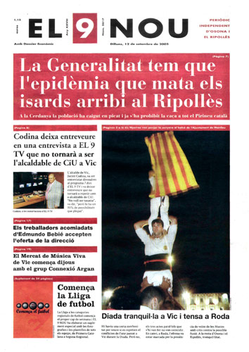 20050912 20050912 | El 9 Nou 12/09/2005 Notícies relacionades LA PREGUNTA Veu bé que el president dels bisbes espanyols opini sobre política? Sí No En aquesta enquesta han votat 291 persones. Vota Les + vistes Set detinguts i una vintena de denúncies en un dispositiu Kanpai contra la multireincidència a Vic i Manlleu La febre per trobar el número de loteria de l'anunci d'un torró ha arribat fins a Tona Fan malbé el ninot de l'escola Joan Maragall de Ripoll Obriran un centre privat de diagnòstic per la imatge a Vic amb una inversió de 6 milions d'euros Girbau celebra un dinar de jubilats a les portes de Nadal El personal sanitari del CAP del Remei de Vic fa un pessebre vivent solidari Osona Ripolles Els pobles osonencs que pertanyen a Girona no es plantegen demanar un canvi de província La Generalitat confirma el futur Palau de Justícia a l’Era d’en Sellés de Vic Aliança Catalana aconsegueix a última hora els suports per salvar 2,7 milions d'Europa per la nau del Pla de Ripoll