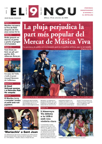 20050919 20050919 | El 9 Nou 19/09/2005 Notícies relacionades LA PREGUNTA Veu bé que el president dels bisbes espanyols opini sobre política? Sí No En aquesta enquesta han votat 297 persones. Vota Les + vistes Set detinguts i una vintena de denúncies en un dispositiu Kanpai contra la multireincidència a Vic i Manlleu Fan malbé el ninot de l'escola Joan Maragall de Ripoll Obriran un centre privat de diagnòstic per la imatge a Vic amb una inversió de 6 milions d'euros La febre per trobar el número de loteria de l'anunci d'un torró ha arribat fins a Tona El personal sanitari del CAP del Remei de Vic fa un pessebre vivent solidari Girbau celebra un dinar de jubilats a les portes de Nadal Els germans Pujol de la Granja Armengol, els nous 'influencers' de la vida a pagès La Generalitat confirma el futur Palau de Justícia a l’Era d’en Sellés de Vic Els pobles osonencs que pertanyen a Girona no es plantegen demanar un canvi de província Refredat, grip i covid: símptomes semblants però malalties diferents