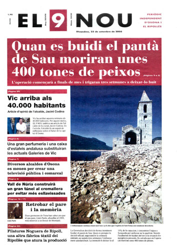 20050923 20050923 | El 9 Nou 23/09/2005 Notícies relacionades LA PREGUNTA Veu bé que el president dels bisbes espanyols opini sobre política? Sí No En aquesta enquesta han votat 291 persones. Vota Les + vistes Set detinguts i una vintena de denúncies en un dispositiu Kanpai contra la multireincidència a Vic i Manlleu La febre per trobar el número de loteria de l'anunci d'un torró ha arribat fins a Tona Fan malbé el ninot de l'escola Joan Maragall de Ripoll Obriran un centre privat de diagnòstic per la imatge a Vic amb una inversió de 6 milions d'euros Girbau celebra un dinar de jubilats a les portes de Nadal El personal sanitari del CAP del Remei de Vic fa un pessebre vivent solidari Osona Ripolles Els pobles osonencs que pertanyen a Girona no es plantegen demanar un canvi de província La Generalitat confirma el futur Palau de Justícia a l’Era d’en Sellés de Vic Aliança Catalana aconsegueix a última hora els suports per salvar 2,7 milions d'Europa per la nau del Pla de Ripoll