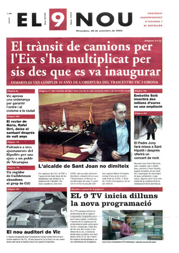 20050930 20050930 | El 9 Nou 30/09/2005 Notícies relacionades LA PREGUNTA Veu bé que el president dels bisbes espanyols opini sobre política? Sí No En aquesta enquesta han votat 324 persones. Vota Les + vistes Set detinguts i una vintena de denúncies en un dispositiu Kanpai contra la multireincidència a Vic i Manlleu Fan malbé el ninot de l'escola Joan Maragall de Ripoll Obriran un centre privat de diagnòstic per la imatge a Vic amb una inversió de 6 milions d'euros La febre per trobar el número de loteria de l'anunci d'un torró ha arribat fins a Tona El personal sanitari del CAP del Remei de Vic fa un pessebre vivent solidari Girbau celebra un dinar de jubilats a les portes de Nadal Els germans Pujol de la Granja Armengol, els nous 'influencers' de la vida a pagès La Generalitat confirma el futur Palau de Justícia a l’Era d’en Sellés de Vic Els pobles osonencs que pertanyen a Girona no es plantegen demanar un canvi de província Refredat, grip i covid: símptomes semblants però malalties diferents