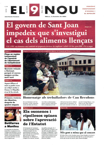 20051003 20051003 | El 9 Nou 03/10/2005 Notícies relacionades LA PREGUNTA Veu bé que el president dels bisbes espanyols opini sobre política? Sí No En aquesta enquesta han votat 324 persones. Vota Les + vistes Set detinguts i una vintena de denúncies en un dispositiu Kanpai contra la multireincidència a Vic i Manlleu Fan malbé el ninot de l'escola Joan Maragall de Ripoll Obriran un centre privat de diagnòstic per la imatge a Vic amb una inversió de 6 milions d'euros La febre per trobar el número de loteria de l'anunci d'un torró ha arribat fins a Tona El personal sanitari del CAP del Remei de Vic fa un pessebre vivent solidari Girbau celebra un dinar de jubilats a les portes de Nadal Els germans Pujol de la Granja Armengol, els nous 'influencers' de la vida a pagès La Generalitat confirma el futur Palau de Justícia a l’Era d’en Sellés de Vic Els pobles osonencs que pertanyen a Girona no es plantegen demanar un canvi de província Refredat, grip i covid: símptomes semblants però malalties diferents