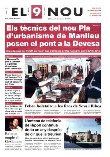 20051010 20051010 | El 9 Nou 10/10/2005 Notícies relacionades LA PREGUNTA Veu bé que el president dels bisbes espanyols opini sobre política? Sí No En aquesta enquesta han votat 291 persones. Vota Les + vistes Set detinguts i una vintena de denúncies en un dispositiu Kanpai contra la multireincidència a Vic i Manlleu La febre per trobar el número de loteria de l'anunci d'un torró ha arribat fins a Tona Fan malbé el ninot de l'escola Joan Maragall de Ripoll Obriran un centre privat de diagnòstic per la imatge a Vic amb una inversió de 6 milions d'euros Girbau celebra un dinar de jubilats a les portes de Nadal El personal sanitari del CAP del Remei de Vic fa un pessebre vivent solidari Osona Ripolles Els pobles osonencs que pertanyen a Girona no es plantegen demanar un canvi de província La Generalitat confirma el futur Palau de Justícia a l’Era d’en Sellés de Vic Aliança Catalana aconsegueix a última hora els suports per salvar 2,7 milions d'Europa per la nau del Pla de Ripoll