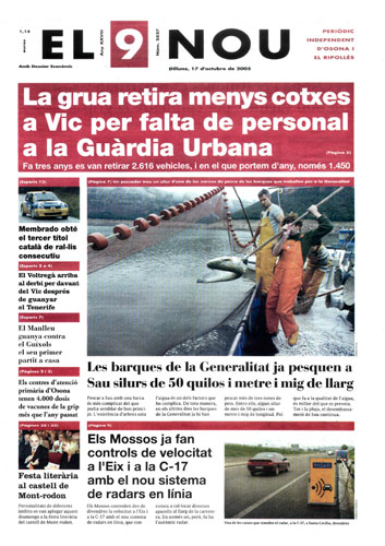 20051017 20051017 | El 9 Nou 17/10/2005 Notícies relacionades LA PREGUNTA Veu bé que el president dels bisbes espanyols opini sobre política? Sí No En aquesta enquesta han votat 291 persones. Vota Les + vistes Set detinguts i una vintena de denúncies en un dispositiu Kanpai contra la multireincidència a Vic i Manlleu La febre per trobar el número de loteria de l'anunci d'un torró ha arribat fins a Tona Fan malbé el ninot de l'escola Joan Maragall de Ripoll Obriran un centre privat de diagnòstic per la imatge a Vic amb una inversió de 6 milions d'euros Girbau celebra un dinar de jubilats a les portes de Nadal El personal sanitari del CAP del Remei de Vic fa un pessebre vivent solidari Osona Ripolles Els pobles osonencs que pertanyen a Girona no es plantegen demanar un canvi de província La Generalitat confirma el futur Palau de Justícia a l’Era d’en Sellés de Vic Aliança Catalana aconsegueix a última hora els suports per salvar 2,7 milions d'Europa per la nau del Pla de Ripoll