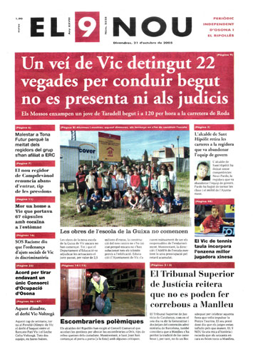 20051021 20051021 | El 9 Nou 21/10/2005 Notícies relacionades LA PREGUNTA Veu bé que el president dels bisbes espanyols opini sobre política? Sí No En aquesta enquesta han votat 291 persones. Vota Les + vistes Set detinguts i una vintena de denúncies en un dispositiu Kanpai contra la multireincidència a Vic i Manlleu La febre per trobar el número de loteria de l'anunci d'un torró ha arribat fins a Tona Fan malbé el ninot de l'escola Joan Maragall de Ripoll Obriran un centre privat de diagnòstic per la imatge a Vic amb una inversió de 6 milions d'euros Girbau celebra un dinar de jubilats a les portes de Nadal El personal sanitari del CAP del Remei de Vic fa un pessebre vivent solidari Osona Ripolles Els pobles osonencs que pertanyen a Girona no es plantegen demanar un canvi de província La Generalitat confirma el futur Palau de Justícia a l’Era d’en Sellés de Vic Aliança Catalana aconsegueix a última hora els suports per salvar 2,7 milions d'Europa per la nau del Pla de Ripoll