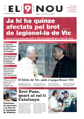 20051031 20051031 | El 9 Nou 31/10/2005 Notícies relacionades LA PREGUNTA Veu bé que el president dels bisbes espanyols opini sobre política? Sí No En aquesta enquesta han votat 291 persones. Vota Les + vistes Set detinguts i una vintena de denúncies en un dispositiu Kanpai contra la multireincidència a Vic i Manlleu La febre per trobar el número de loteria de l'anunci d'un torró ha arribat fins a Tona Fan malbé el ninot de l'escola Joan Maragall de Ripoll Obriran un centre privat de diagnòstic per la imatge a Vic amb una inversió de 6 milions d'euros Girbau celebra un dinar de jubilats a les portes de Nadal El personal sanitari del CAP del Remei de Vic fa un pessebre vivent solidari Osona Ripolles Els pobles osonencs que pertanyen a Girona no es plantegen demanar un canvi de província La Generalitat confirma el futur Palau de Justícia a l’Era d’en Sellés de Vic Aliança Catalana aconsegueix a última hora els suports per salvar 2,7 milions d'Europa per la nau del Pla de Ripoll