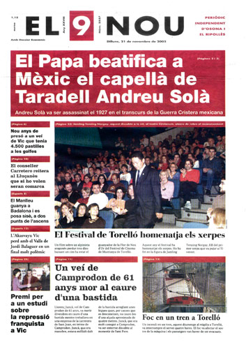 20051121 20051121 | El 9 Nou 21/11/2005 Notícies relacionades LA PREGUNTA Veu bé que el president dels bisbes espanyols opini sobre política? Sí No En aquesta enquesta han votat 245 persones. Vota Les + vistes Set detinguts i una vintena de denúncies en un dispositiu Kanpai contra la multireincidència a Vic i Manlleu La febre per trobar el número de loteria de l'anunci d'un torró ha arribat fins a Tona Fan malbé el ninot de l'escola Joan Maragall de Ripoll Obriran un centre privat de diagnòstic per la imatge a Vic amb una inversió de 6 milions d'euros Girbau celebra un dinar de jubilats a les portes de Nadal El personal sanitari del CAP del Remei de Vic fa un pessebre vivent solidari Osona Ripolles Els pobles osonencs que pertanyen a Girona no es plantegen demanar un canvi de província La Generalitat confirma el futur Palau de Justícia a l’Era d’en Sellés de Vic Aliança Catalana aconsegueix a última hora els suports per salvar 2,7 milions d'Europa per la nau del Pla de Ripoll