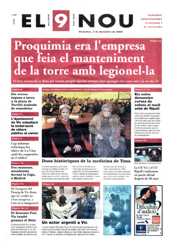 20051202 20051202 | El 9 Nou 02/12/2005 Notícies relacionades LA PREGUNTA Veu bé que el president dels bisbes espanyols opini sobre política? Sí No En aquesta enquesta han votat 189 persones. Vota Les + vistes La febre per trobar el número de loteria de l'anunci d'un torró ha arribat fins a Tona Set detinguts i una vintena de denúncies en un dispositiu Kanpai contra la multireincidència a Vic i Manlleu Fan malbé el ninot de l'escola Joan Maragall de Ripoll Obriran un centre privat de diagnòstic per la imatge a Vic amb una inversió de 6 milions d'euros La Rosada de Prats de Lluçanès obre portes a una nova manera de viure i envellir al món rural Girbau celebra un dinar de jubilats a les portes de Nadal Osona Ripolles Els pobles osonencs que pertanyen a Girona no es plantegen demanar un canvi de província S’encén un cotxe a l’Eix Transversal, a Muntanyola Osona es coordinarà per abordar de manera conjunta el problema del sensellarisme