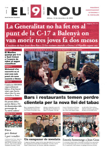 20051212 20051212 | El 9 Nou 12/12/2005 Notícies relacionades LA PREGUNTA Veu bé que el president dels bisbes espanyols opini sobre política? Sí No En aquesta enquesta han votat 189 persones. Vota Les + vistes La febre per trobar el número de loteria de l'anunci d'un torró ha arribat fins a Tona Set detinguts i una vintena de denúncies en un dispositiu Kanpai contra la multireincidència a Vic i Manlleu Fan malbé el ninot de l'escola Joan Maragall de Ripoll Obriran un centre privat de diagnòstic per la imatge a Vic amb una inversió de 6 milions d'euros La Rosada de Prats de Lluçanès obre portes a una nova manera de viure i envellir al món rural Girbau celebra un dinar de jubilats a les portes de Nadal Osona Ripolles Els pobles osonencs que pertanyen a Girona no es plantegen demanar un canvi de província S’encén un cotxe a l’Eix Transversal, a Muntanyola Osona es coordinarà per abordar de manera conjunta el problema del sensellarisme