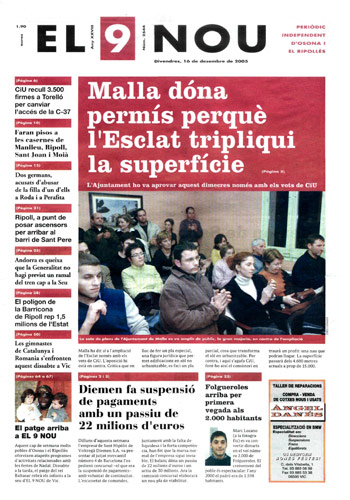 20051216 20051216 | El 9 Nou 16/12/2005 Notícies relacionades LA PREGUNTA Veu bé que el president dels bisbes espanyols opini sobre política? Sí No En aquesta enquesta han votat 189 persones. Vota Les + vistes La febre per trobar el número de loteria de l'anunci d'un torró ha arribat fins a Tona Set detinguts i una vintena de denúncies en un dispositiu Kanpai contra la multireincidència a Vic i Manlleu Fan malbé el ninot de l'escola Joan Maragall de Ripoll Obriran un centre privat de diagnòstic per la imatge a Vic amb una inversió de 6 milions d'euros La Rosada de Prats de Lluçanès obre portes a una nova manera de viure i envellir al món rural Girbau celebra un dinar de jubilats a les portes de Nadal Osona Ripolles Els pobles osonencs que pertanyen a Girona no es plantegen demanar un canvi de província S’encén un cotxe a l’Eix Transversal, a Muntanyola Osona es coordinarà per abordar de manera conjunta el problema del sensellarisme