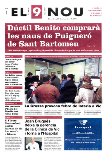 20051230 20051230 | El 9 Nou 30/12/2005 Notícies relacionades LA PREGUNTA Veu bé que el president dels bisbes espanyols opini sobre política? Sí No En aquesta enquesta han votat 189 persones. Vota Les + vistes La febre per trobar el número de loteria de l'anunci d'un torró ha arribat fins a Tona Set detinguts i una vintena de denúncies en un dispositiu Kanpai contra la multireincidència a Vic i Manlleu Fan malbé el ninot de l'escola Joan Maragall de Ripoll Obriran un centre privat de diagnòstic per la imatge a Vic amb una inversió de 6 milions d'euros La Rosada de Prats de Lluçanès obre portes a una nova manera de viure i envellir al món rural Girbau celebra un dinar de jubilats a les portes de Nadal Osona Ripolles Els pobles osonencs que pertanyen a Girona no es plantegen demanar un canvi de província S’encén un cotxe a l’Eix Transversal, a Muntanyola Osona es coordinarà per abordar de manera conjunta el problema del sensellarisme