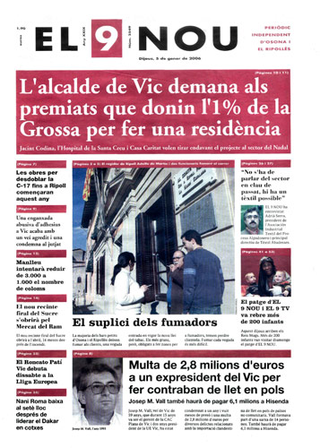 20060105 20060105 | El 9 Nou 05/01/2006 Notícies relacionades LA PREGUNTA Veu bé que el president dels bisbes espanyols opini sobre política? Sí No En aquesta enquesta han votat 189 persones. Vota Les + vistes La febre per trobar el número de loteria de l'anunci d'un torró ha arribat fins a Tona Set detinguts i una vintena de denúncies en un dispositiu Kanpai contra la multireincidència a Vic i Manlleu Fan malbé el ninot de l'escola Joan Maragall de Ripoll Obriran un centre privat de diagnòstic per la imatge a Vic amb una inversió de 6 milions d'euros La Rosada de Prats de Lluçanès obre portes a una nova manera de viure i envellir al món rural Girbau celebra un dinar de jubilats a les portes de Nadal Osona Ripolles Els pobles osonencs que pertanyen a Girona no es plantegen demanar un canvi de província S’encén un cotxe a l’Eix Transversal, a Muntanyola Osona es coordinarà per abordar de manera conjunta el problema del sensellarisme