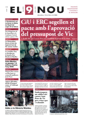 20060210 20060210 | El 9 Nou 10/02/2006 Notícies relacionades LA PREGUNTA Veu bé que el president dels bisbes espanyols opini sobre política? Sí No En aquesta enquesta han votat 143 persones. Vota Les + vistes Set detinguts i una vintena de denúncies en un dispositiu Kanpai contra la multireincidència a Vic i Manlleu La febre per trobar el número de loteria de l'anunci d'un torró ha arribat fins a Tona Fan malbé el ninot de l'escola Joan Maragall de Ripoll La Rosada de Prats de Lluçanès obre portes a una nova manera de viure i envellir al món rural Tres persones intoxicades per monòxid de carboni als Hostalets de Balenyà Girbau celebra un dinar de jubilats a les portes de Nadal Les millors imatges del Mercat Medieval de Vic Osona Ripolles S’encén un cotxe a l’Eix Transversal, a Muntanyola “Portem 22 mesos queixant-nos dels paons i no ens fan cas”