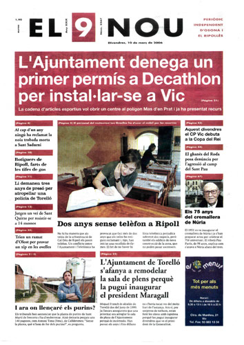 20060310 20060310 | El 9 Nou 10/03/2006 Notícies relacionades LA PREGUNTA Veu bé que el president dels bisbes espanyols opini sobre política? Sí No En aquesta enquesta han votat 143 persones. Vota Les + vistes Set detinguts i una vintena de denúncies en un dispositiu Kanpai contra la multireincidència a Vic i Manlleu La febre per trobar el número de loteria de l'anunci d'un torró ha arribat fins a Tona Fan malbé el ninot de l'escola Joan Maragall de Ripoll La Rosada de Prats de Lluçanès obre portes a una nova manera de viure i envellir al món rural Tres persones intoxicades per monòxid de carboni als Hostalets de Balenyà Girbau celebra un dinar de jubilats a les portes de Nadal Les millors imatges del Mercat Medieval de Vic Osona Ripolles S’encén un cotxe a l’Eix Transversal, a Muntanyola “Portem 22 mesos queixant-nos dels paons i no ens fan cas”