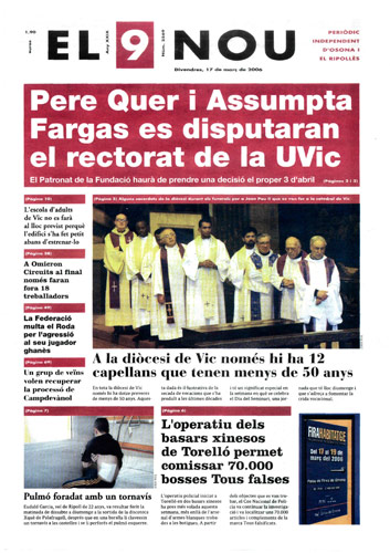 20060317 20060317 | El 9 Nou 17/03/2006 Notícies relacionades LA PREGUNTA Veu bé que el president dels bisbes espanyols opini sobre política? Sí No En aquesta enquesta han votat 151 persones. Vota Les + vistes Set detinguts i una vintena de denúncies en un dispositiu Kanpai contra la multireincidència a Vic i Manlleu La febre per trobar el número de loteria de l'anunci d'un torró ha arribat fins a Tona Fan malbé el ninot de l'escola Joan Maragall de Ripoll La Rosada de Prats de Lluçanès obre portes a una nova manera de viure i envellir al món rural Tres persones intoxicades per monòxid de carboni als Hostalets de Balenyà Girbau celebra un dinar de jubilats a les portes de Nadal Les millors imatges del Mercat Medieval de Vic Osona Ripolles S’encén un cotxe a l’Eix Transversal, a Muntanyola “Portem 22 mesos queixant-nos dels paons i no ens fan cas”