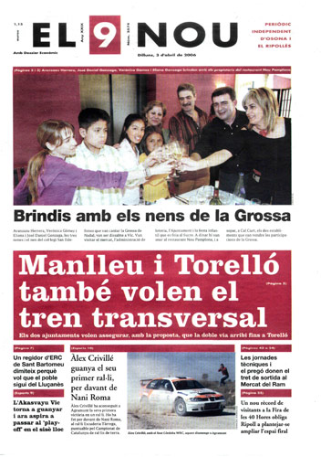 20060403 20060403 | El 9 Nou 03/04/2006 Notícies relacionades LA PREGUNTA Veu bé que el president dels bisbes espanyols opini sobre política? Sí No En aquesta enquesta han votat 143 persones. Vota Les + vistes Set detinguts i una vintena de denúncies en un dispositiu Kanpai contra la multireincidència a Vic i Manlleu La febre per trobar el número de loteria de l'anunci d'un torró ha arribat fins a Tona Fan malbé el ninot de l'escola Joan Maragall de Ripoll La Rosada de Prats de Lluçanès obre portes a una nova manera de viure i envellir al món rural Tres persones intoxicades per monòxid de carboni als Hostalets de Balenyà Girbau celebra un dinar de jubilats a les portes de Nadal Les millors imatges del Mercat Medieval de Vic Osona Ripolles S’encén un cotxe a l’Eix Transversal, a Muntanyola “Portem 22 mesos queixant-nos dels paons i no ens fan cas”