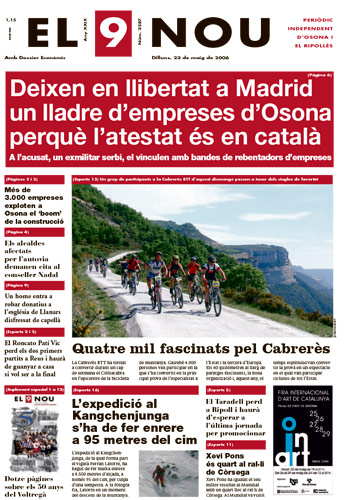 20060522 20060522 | El 9 Nou 22/05/2006 Notícies relacionades LA PREGUNTA Veu bé que el president dels bisbes espanyols opini sobre política? Sí No En aquesta enquesta han votat 151 persones. Vota Les + vistes Set detinguts i una vintena de denúncies en un dispositiu Kanpai contra la multireincidència a Vic i Manlleu La febre per trobar el número de loteria de l'anunci d'un torró ha arribat fins a Tona Fan malbé el ninot de l'escola Joan Maragall de Ripoll La Rosada de Prats de Lluçanès obre portes a una nova manera de viure i envellir al món rural Tres persones intoxicades per monòxid de carboni als Hostalets de Balenyà Girbau celebra un dinar de jubilats a les portes de Nadal Les millors imatges del Mercat Medieval de Vic Osona Ripolles S’encén un cotxe a l’Eix Transversal, a Muntanyola “Portem 22 mesos queixant-nos dels paons i no ens fan cas”