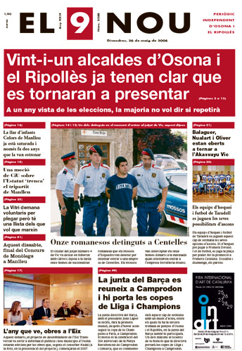 20060526 20060526 | El 9 Nou 26/05/2006 Notícies relacionades LA PREGUNTA Veu bé que el president dels bisbes espanyols opini sobre política? Sí No En aquesta enquesta han votat 151 persones. Vota Les + vistes Set detinguts i una vintena de denúncies en un dispositiu Kanpai contra la multireincidència a Vic i Manlleu La febre per trobar el número de loteria de l'anunci d'un torró ha arribat fins a Tona Fan malbé el ninot de l'escola Joan Maragall de Ripoll La Rosada de Prats de Lluçanès obre portes a una nova manera de viure i envellir al món rural Tres persones intoxicades per monòxid de carboni als Hostalets de Balenyà Girbau celebra un dinar de jubilats a les portes de Nadal Les millors imatges del Mercat Medieval de Vic Osona Ripolles S’encén un cotxe a l’Eix Transversal, a Muntanyola “Portem 22 mesos queixant-nos dels paons i no ens fan cas”