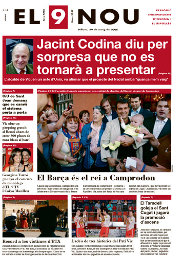 20060529 20060529 | El 9 Nou 29/05/2006 Notícies relacionades LA PREGUNTA Veu bé que el president dels bisbes espanyols opini sobre política? Sí No En aquesta enquesta han votat 151 persones. Vota Les + vistes Set detinguts i una vintena de denúncies en un dispositiu Kanpai contra la multireincidència a Vic i Manlleu La febre per trobar el número de loteria de l'anunci d'un torró ha arribat fins a Tona Fan malbé el ninot de l'escola Joan Maragall de Ripoll La Rosada de Prats de Lluçanès obre portes a una nova manera de viure i envellir al món rural Tres persones intoxicades per monòxid de carboni als Hostalets de Balenyà Girbau celebra un dinar de jubilats a les portes de Nadal Les millors imatges del Mercat Medieval de Vic Osona Ripolles S’encén un cotxe a l’Eix Transversal, a Muntanyola “Portem 22 mesos queixant-nos dels paons i no ens fan cas”