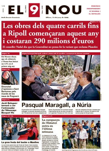 20060612 20060612 | El 9 Nou 12/06/2006 Notícies relacionades LA PREGUNTA Veu bé que el president dels bisbes espanyols opini sobre política? Sí No En aquesta enquesta han votat 143 persones. Vota Les + vistes Set detinguts i una vintena de denúncies en un dispositiu Kanpai contra la multireincidència a Vic i Manlleu La febre per trobar el número de loteria de l'anunci d'un torró ha arribat fins a Tona Fan malbé el ninot de l'escola Joan Maragall de Ripoll La Rosada de Prats de Lluçanès obre portes a una nova manera de viure i envellir al món rural Tres persones intoxicades per monòxid de carboni als Hostalets de Balenyà Girbau celebra un dinar de jubilats a les portes de Nadal Les millors imatges del Mercat Medieval de Vic Osona Ripolles S’encén un cotxe a l’Eix Transversal, a Muntanyola “Portem 22 mesos queixant-nos dels paons i no ens fan cas”