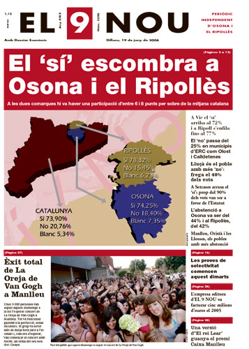 20060619 20060619 | El 9 Nou 19/06/2006 Notícies relacionades LA PREGUNTA Veu bé que el president dels bisbes espanyols opini sobre política? Sí No En aquesta enquesta han votat 143 persones. Vota Les + vistes Set detinguts i una vintena de denúncies en un dispositiu Kanpai contra la multireincidència a Vic i Manlleu La febre per trobar el número de loteria de l'anunci d'un torró ha arribat fins a Tona Fan malbé el ninot de l'escola Joan Maragall de Ripoll La Rosada de Prats de Lluçanès obre portes a una nova manera de viure i envellir al món rural Tres persones intoxicades per monòxid de carboni als Hostalets de Balenyà Girbau celebra un dinar de jubilats a les portes de Nadal Les millors imatges del Mercat Medieval de Vic Osona Ripolles S’encén un cotxe a l’Eix Transversal, a Muntanyola “Portem 22 mesos queixant-nos dels paons i no ens fan cas”