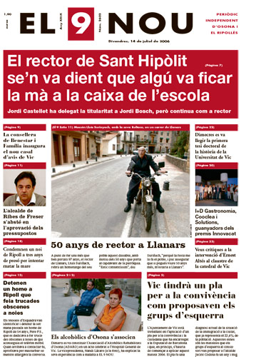 20060714 20060714 | El 9 Nou 14/07/2006 Notícies relacionades LA PREGUNTA Veu bé que el president dels bisbes espanyols opini sobre política? Sí No En aquesta enquesta han votat 143 persones. Vota Les + vistes Set detinguts i una vintena de denúncies en un dispositiu Kanpai contra la multireincidència a Vic i Manlleu La febre per trobar el número de loteria de l'anunci d'un torró ha arribat fins a Tona Fan malbé el ninot de l'escola Joan Maragall de Ripoll La Rosada de Prats de Lluçanès obre portes a una nova manera de viure i envellir al món rural Tres persones intoxicades per monòxid de carboni als Hostalets de Balenyà Girbau celebra un dinar de jubilats a les portes de Nadal Les millors imatges del Mercat Medieval de Vic Osona Ripolles S’encén un cotxe a l’Eix Transversal, a Muntanyola “Portem 22 mesos queixant-nos dels paons i no ens fan cas”