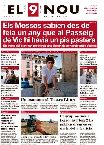 20060724 20060724 | El 9 Nou 24/07/2006 Notícies relacionades LA PREGUNTA Està d’acord amb la posició del govern espanyol sobre la guerra a l’Iran? Sí No En aquesta enquesta han votat 610 persones. Vota Les + vistes Dues botigues d'un mateix joier pateixen dos atracaments a Vic en menys de quinze dies Condueix sense carnet i té un accident a la carretera de Taradell a Santa Eugènia La N-260 continua tallada fins dilluns "com a mínim" per l'esllavissada a Sant Joan Dos incendis en uns baixos de Vic en poca estona i a 500 metres de distància Denuncien un conductor a la C-17 a Tona perquè portava el gos traient el cap per la finestra Què és aquest color verd del marge del riu Méder? Troben sense vida al Collsacabra un home que estava en recerca des del matí Localitzen un excursionista perdut al Collsacabra La N-260 a Sant Joan obre un carril després de l'esllavissada de divendres L'Ajuntament de Torelló talla una connexió il·legal d'aigua en un habitatge ocupat