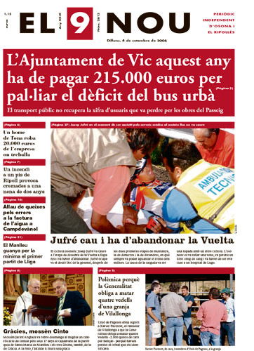 20060904 20060904 | El 9 Nou 04/09/2006 Notícies relacionades LA PREGUNTA Està d’acord amb la posició del govern espanyol sobre la guerra a l’Iran? Sí No En aquesta enquesta han votat 615 persones. Vota Les + vistes Dues botigues d'un mateix joier pateixen dos atracaments a Vic en menys de quinze dies Condueix sense carnet i té un accident a la carretera de Taradell a Santa Eugènia La N-260 continua tallada fins dilluns "com a mínim" per l'esllavissada a Sant Joan Dos incendis en uns baixos de Vic en poca estona i a 500 metres de distància Denuncien un conductor a la C-17 a Tona perquè portava el gos traient el cap per la finestra Què és aquest color verd del marge del riu Méder? Troben sense vida al Collsacabra un home que estava en recerca des del matí Localitzen un excursionista perdut al Collsacabra La N-260 a Sant Joan obre un carril després de l'esllavissada de divendres L'Ajuntament de Torelló talla una connexió il·legal d'aigua en un habitatge ocupat