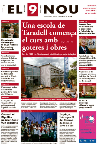 20060915 20060915 | El 9 Nou 15/09/2006 Notícies relacionades LA PREGUNTA Està d’acord amb la posició del govern espanyol sobre la guerra a l’Iran? Sí No En aquesta enquesta han votat 615 persones. Vota Les + vistes Dues botigues d'un mateix joier pateixen dos atracaments a Vic en menys de quinze dies Condueix sense carnet i té un accident a la carretera de Taradell a Santa Eugènia La N-260 continua tallada fins dilluns "com a mínim" per l'esllavissada a Sant Joan Dos incendis en uns baixos de Vic en poca estona i a 500 metres de distància Denuncien un conductor a la C-17 a Tona perquè portava el gos traient el cap per la finestra Què és aquest color verd del marge del riu Méder? Troben sense vida al Collsacabra un home que estava en recerca des del matí Localitzen un excursionista perdut al Collsacabra La N-260 a Sant Joan obre un carril després de l'esllavissada de divendres L'Ajuntament de Torelló talla una connexió il·legal d'aigua en un habitatge ocupat