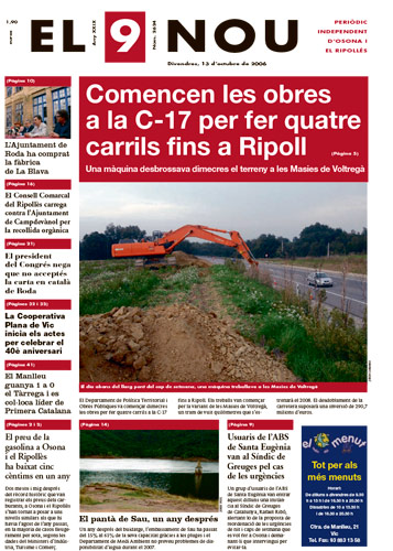 20061013 20061013 | El 9 Nou 13/10/2006 Notícies relacionades LA PREGUNTA Veu bé que el president dels bisbes espanyols opini sobre política? Sí No En aquesta enquesta han votat 133 persones. Vota Les + vistes Les millors imatges del Mercat Medieval de Vic La febre per trobar el número de loteria de l'anunci d'un torró ha arribat fins a Tona Tres persones intoxicades per monòxid de carboni als Hostalets de Balenyà Set detinguts i una vintena de denúncies en un dispositiu Kanpai contra la multireincidència a Vic i Manlleu Febre pel dècim que surt a l’anunci del torró La Rosada de Prats de Lluçanès obre portes a una nova manera de viure i envellir al món rural Girbau celebra un dinar de jubilats a les portes de Nadal “Portem 22 mesos queixant-nos dels paons i no ens fan cas” El veí de Barcelona investigat per un terreny a Manlleu evita declarar Salvador Illa visita Espinelves i Folgueroles