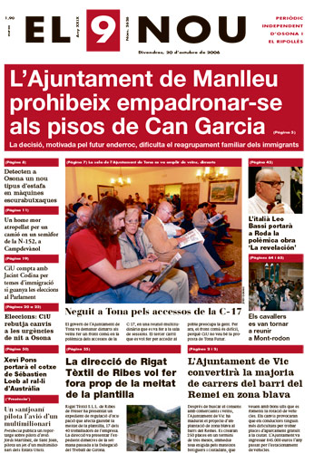 20061020 20061020 | El 9 Nou 20/10/2006 Notícies relacionades LA PREGUNTA Veu bé que el president dels bisbes espanyols opini sobre política? Sí No En aquesta enquesta han votat 133 persones. Vota Les + vistes Les millors imatges del Mercat Medieval de Vic La febre per trobar el número de loteria de l'anunci d'un torró ha arribat fins a Tona Tres persones intoxicades per monòxid de carboni als Hostalets de Balenyà Set detinguts i una vintena de denúncies en un dispositiu Kanpai contra la multireincidència a Vic i Manlleu Febre pel dècim que surt a l’anunci del torró La Rosada de Prats de Lluçanès obre portes a una nova manera de viure i envellir al món rural Girbau celebra un dinar de jubilats a les portes de Nadal “Portem 22 mesos queixant-nos dels paons i no ens fan cas” El veí de Barcelona investigat per un terreny a Manlleu evita declarar Salvador Illa visita Espinelves i Folgueroles
