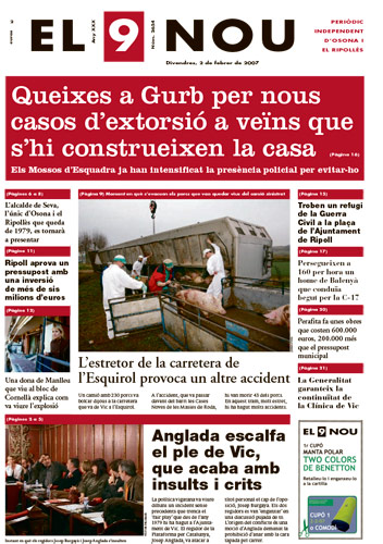 20070202 20070202 | El 9 Nou 02/02/2007 Notícies relacionades LA PREGUNTA Veu bé que el president dels bisbes espanyols opini sobre política? Sí No En aquesta enquesta han votat 133 persones. Vota Les + vistes Les millors imatges del Mercat Medieval de Vic La febre per trobar el número de loteria de l'anunci d'un torró ha arribat fins a Tona Tres persones intoxicades per monòxid de carboni als Hostalets de Balenyà Set detinguts i una vintena de denúncies en un dispositiu Kanpai contra la multireincidència a Vic i Manlleu Febre pel dècim que surt a l’anunci del torró La Rosada de Prats de Lluçanès obre portes a una nova manera de viure i envellir al món rural Girbau celebra un dinar de jubilats a les portes de Nadal “Portem 22 mesos queixant-nos dels paons i no ens fan cas” El veí de Barcelona investigat per un terreny a Manlleu evita declarar Salvador Illa visita Espinelves i Folgueroles