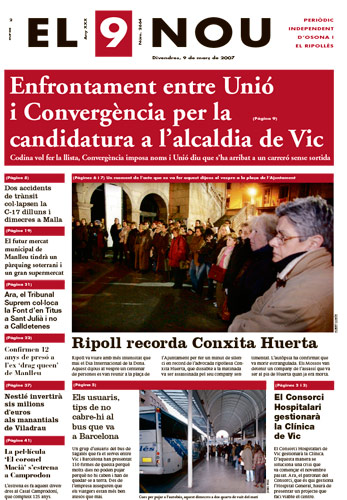 20070309 20070309 | El 9 Nou 09/03/2007 Notícies relacionades LA PREGUNTA Veu bé que el president dels bisbes espanyols opini sobre política? Sí No En aquesta enquesta han votat 189 persones. Vota Les + vistes La febre per trobar el número de loteria de l'anunci d'un torró ha arribat fins a Tona Set detinguts i una vintena de denúncies en un dispositiu Kanpai contra la multireincidència a Vic i Manlleu Fan malbé el ninot de l'escola Joan Maragall de Ripoll Obriran un centre privat de diagnòstic per la imatge a Vic amb una inversió de 6 milions d'euros La Rosada de Prats de Lluçanès obre portes a una nova manera de viure i envellir al món rural Girbau celebra un dinar de jubilats a les portes de Nadal Osona Ripolles Els pobles osonencs que pertanyen a Girona no es plantegen demanar un canvi de província S’encén un cotxe a l’Eix Transversal, a Muntanyola Osona es coordinarà per abordar de manera conjunta el problema del sensellarisme