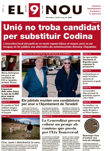 20070323 20070323 | El 9 Nou 23/03/2007 Notícies relacionades LA PREGUNTA Veu bé que el president dels bisbes espanyols opini sobre política? Sí No En aquesta enquesta han votat 141 persones. Vota Les + vistes Les millors imatges del Mercat Medieval de Vic La febre per trobar el número de loteria de l'anunci d'un torró ha arribat fins a Tona Tres persones intoxicades per monòxid de carboni als Hostalets de Balenyà Set detinguts i una vintena de denúncies en un dispositiu Kanpai contra la multireincidència a Vic i Manlleu Febre pel dècim que surt a l’anunci del torró La Rosada de Prats de Lluçanès obre portes a una nova manera de viure i envellir al món rural Girbau celebra un dinar de jubilats a les portes de Nadal “Portem 22 mesos queixant-nos dels paons i no ens fan cas” El veí de Barcelona investigat per un terreny a Manlleu evita declarar Salvador Illa visita Espinelves i Folgueroles