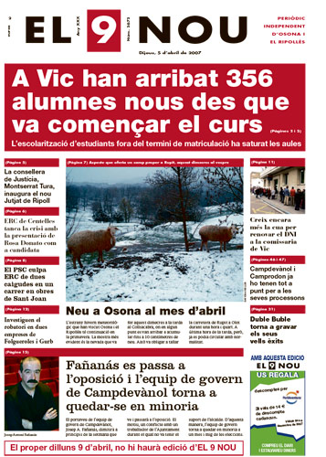 20070405 20070405 | El 9 Nou 05/04/2007 Notícies relacionades LA PREGUNTA Veu bé que el president dels bisbes espanyols opini sobre política? Sí No En aquesta enquesta han votat 141 persones. Vota Les + vistes Les millors imatges del Mercat Medieval de Vic La febre per trobar el número de loteria de l'anunci d'un torró ha arribat fins a Tona Tres persones intoxicades per monòxid de carboni als Hostalets de Balenyà Set detinguts i una vintena de denúncies en un dispositiu Kanpai contra la multireincidència a Vic i Manlleu Febre pel dècim que surt a l’anunci del torró La Rosada de Prats de Lluçanès obre portes a una nova manera de viure i envellir al món rural Girbau celebra un dinar de jubilats a les portes de Nadal “Portem 22 mesos queixant-nos dels paons i no ens fan cas” El veí de Barcelona investigat per un terreny a Manlleu evita declarar Salvador Illa visita Espinelves i Folgueroles