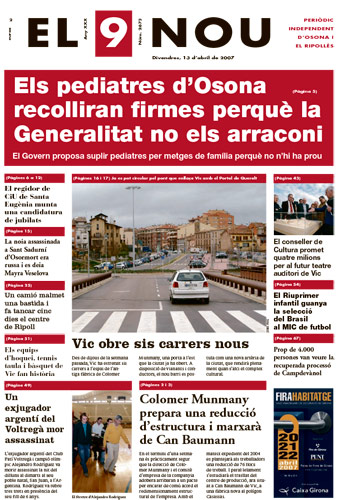 20070413 20070413 | El 9 Nou 13/04/2007 Notícies relacionades LA PREGUNTA Veu bé que el president dels bisbes espanyols opini sobre política? Sí No En aquesta enquesta han votat 245 persones. Vota Les + vistes Set detinguts i una vintena de denúncies en un dispositiu Kanpai contra la multireincidència a Vic i Manlleu La febre per trobar el número de loteria de l'anunci d'un torró ha arribat fins a Tona Fan malbé el ninot de l'escola Joan Maragall de Ripoll Obriran un centre privat de diagnòstic per la imatge a Vic amb una inversió de 6 milions d'euros Girbau celebra un dinar de jubilats a les portes de Nadal El personal sanitari del CAP del Remei de Vic fa un pessebre vivent solidari Osona Ripolles Els pobles osonencs que pertanyen a Girona no es plantegen demanar un canvi de província La Generalitat confirma el futur Palau de Justícia a l’Era d’en Sellés de Vic Aliança Catalana aconsegueix a última hora els suports per salvar 2,7 milions d'Europa per la nau del Pla de Ripoll