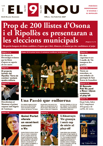 20070416 20070416 | El 9 Nou 16/04/2007 Notícies relacionades LA PREGUNTA Veu bé que el president dels bisbes espanyols opini sobre política? Sí No En aquesta enquesta han votat 245 persones. Vota Les + vistes Set detinguts i una vintena de denúncies en un dispositiu Kanpai contra la multireincidència a Vic i Manlleu La febre per trobar el número de loteria de l'anunci d'un torró ha arribat fins a Tona Fan malbé el ninot de l'escola Joan Maragall de Ripoll Obriran un centre privat de diagnòstic per la imatge a Vic amb una inversió de 6 milions d'euros Girbau celebra un dinar de jubilats a les portes de Nadal El personal sanitari del CAP del Remei de Vic fa un pessebre vivent solidari Osona Ripolles Els pobles osonencs que pertanyen a Girona no es plantegen demanar un canvi de província La Generalitat confirma el futur Palau de Justícia a l’Era d’en Sellés de Vic Aliança Catalana aconsegueix a última hora els suports per salvar 2,7 milions d'Europa per la nau del Pla de Ripoll