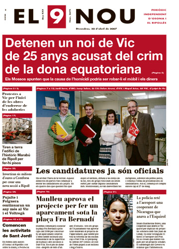 20070420 20070420 | El 9 Nou 20/04/2007 Notícies relacionades LA PREGUNTA Veu bé que el president dels bisbes espanyols opini sobre política? Sí No En aquesta enquesta han votat 141 persones. Vota Les + vistes Les millors imatges del Mercat Medieval de Vic La febre per trobar el número de loteria de l'anunci d'un torró ha arribat fins a Tona Tres persones intoxicades per monòxid de carboni als Hostalets de Balenyà Set detinguts i una vintena de denúncies en un dispositiu Kanpai contra la multireincidència a Vic i Manlleu Febre pel dècim que surt a l’anunci del torró La Rosada de Prats de Lluçanès obre portes a una nova manera de viure i envellir al món rural Girbau celebra un dinar de jubilats a les portes de Nadal “Portem 22 mesos queixant-nos dels paons i no ens fan cas” El veí de Barcelona investigat per un terreny a Manlleu evita declarar Salvador Illa visita Espinelves i Folgueroles