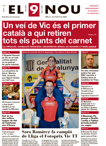 20070423 20070423 | El 9 Nou 23/04/2007 Notícies relacionades LA PREGUNTA Veu bé que el president dels bisbes espanyols opini sobre política? Sí No En aquesta enquesta han votat 121 persones. Vota Les + vistes Les millors imatges del Mercat Medieval de Vic La febre per trobar el número de loteria de l'anunci d'un torró ha arribat fins a Tona Tres persones intoxicades per monòxid de carboni als Hostalets de Balenyà Set detinguts i una vintena de denúncies en un dispositiu Kanpai contra la multireincidència a Vic i Manlleu Febre pel dècim que surt a l’anunci del torró La Rosada de Prats de Lluçanès obre portes a una nova manera de viure i envellir al món rural Girbau celebra un dinar de jubilats a les portes de Nadal “Portem 22 mesos queixant-nos dels paons i no ens fan cas” El veí de Barcelona investigat per un terreny a Manlleu evita declarar Salvador Illa visita Espinelves i Folgueroles