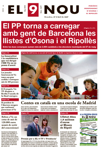 20070427 20070427 | El 9 Nou 27/04/2007 Notícies relacionades LA PREGUNTA Veu bé que el president dels bisbes espanyols opini sobre política? Sí No En aquesta enquesta han votat 283 persones. Vota Les + vistes Set detinguts i una vintena de denúncies en un dispositiu Kanpai contra la multireincidència a Vic i Manlleu La febre per trobar el número de loteria de l'anunci d'un torró ha arribat fins a Tona Fan malbé el ninot de l'escola Joan Maragall de Ripoll Obriran un centre privat de diagnòstic per la imatge a Vic amb una inversió de 6 milions d'euros Girbau celebra un dinar de jubilats a les portes de Nadal El personal sanitari del CAP del Remei de Vic fa un pessebre vivent solidari Osona Ripolles Els pobles osonencs que pertanyen a Girona no es plantegen demanar un canvi de província La Generalitat confirma el futur Palau de Justícia a l’Era d’en Sellés de Vic Aliança Catalana aconsegueix a última hora els suports per salvar 2,7 milions d'Europa per la nau del Pla de Ripoll