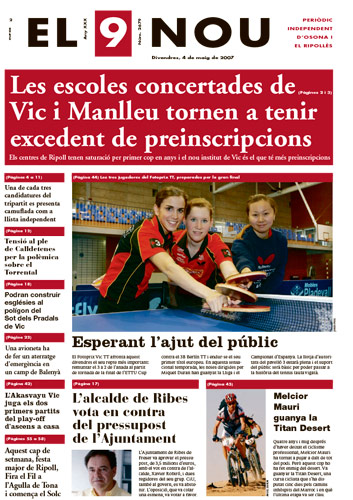 20070504 20070504 | El 9 Nou 04/05/2007 Notícies relacionades LA PREGUNTA Veu bé que el president dels bisbes espanyols opini sobre política? Sí No En aquesta enquesta han votat 141 persones. Vota Les + vistes Les millors imatges del Mercat Medieval de Vic La febre per trobar el número de loteria de l'anunci d'un torró ha arribat fins a Tona Tres persones intoxicades per monòxid de carboni als Hostalets de Balenyà Set detinguts i una vintena de denúncies en un dispositiu Kanpai contra la multireincidència a Vic i Manlleu Febre pel dècim que surt a l’anunci del torró La Rosada de Prats de Lluçanès obre portes a una nova manera de viure i envellir al món rural Girbau celebra un dinar de jubilats a les portes de Nadal “Portem 22 mesos queixant-nos dels paons i no ens fan cas” El veí de Barcelona investigat per un terreny a Manlleu evita declarar Salvador Illa visita Espinelves i Folgueroles